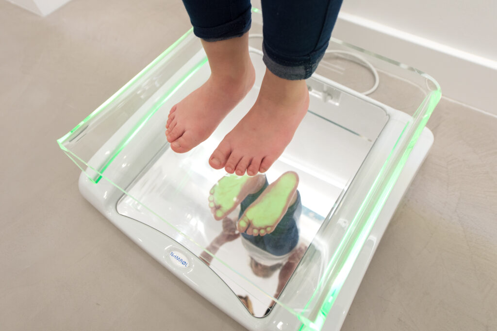 Valoramos la huella, puntos de máxima presión, el centro de gravedad, y un análisis postural del paciente.